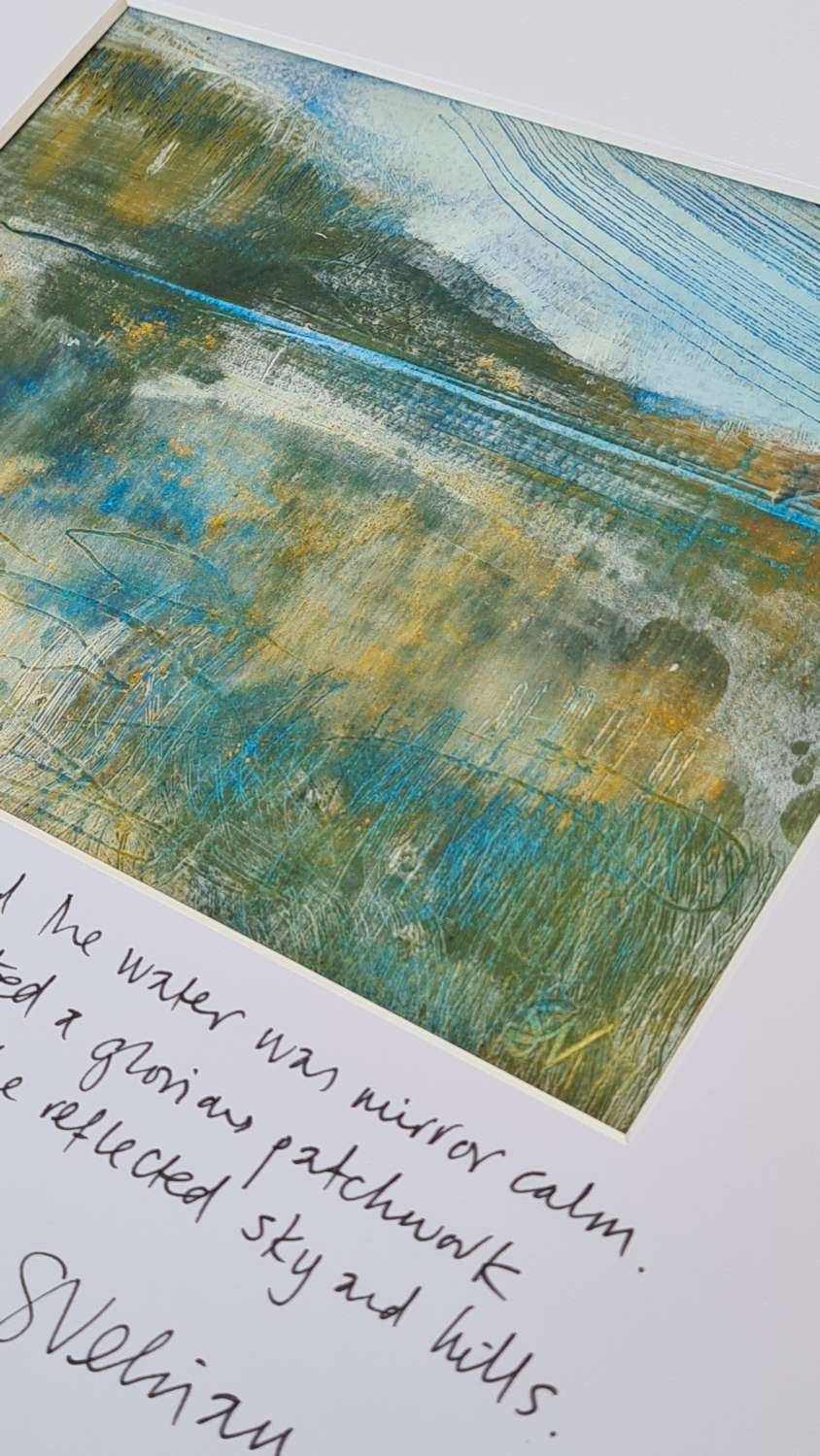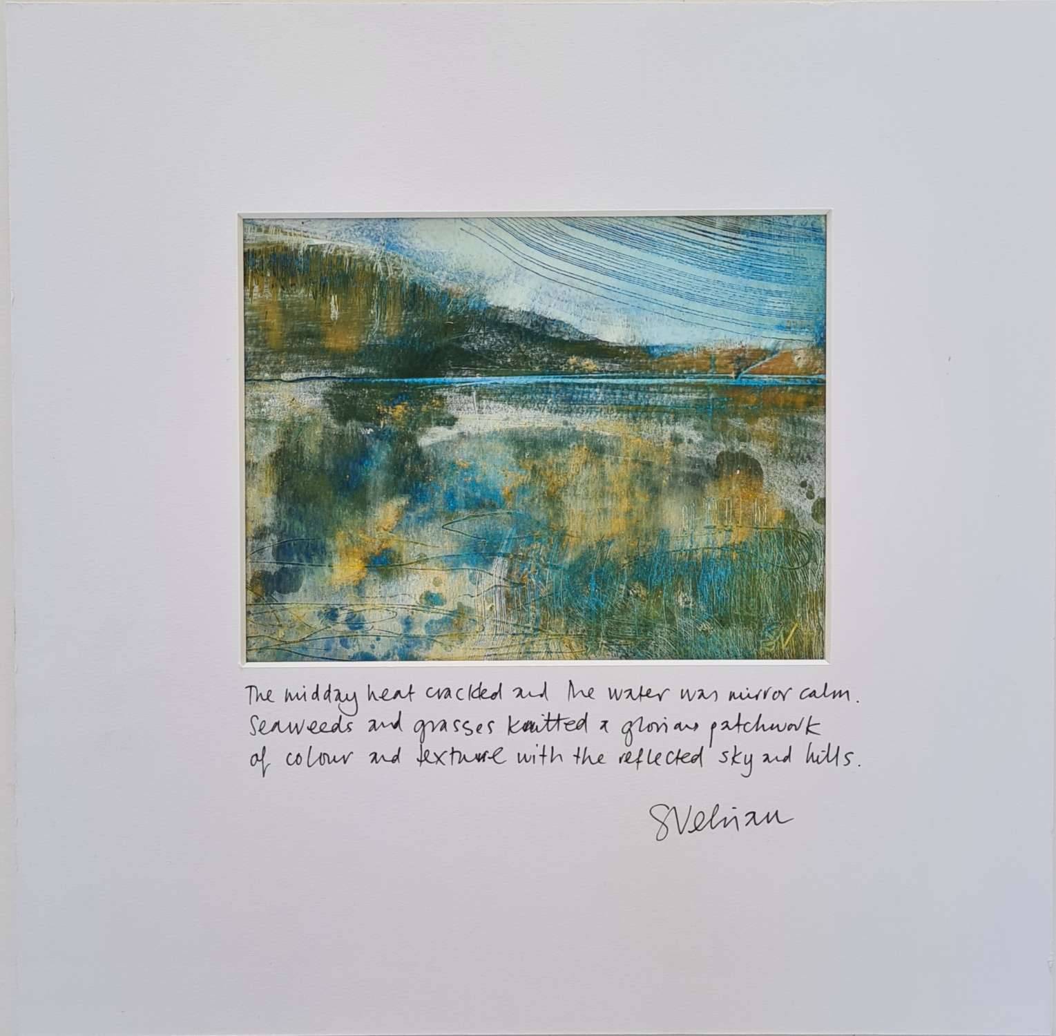 The midday heat crackled and the water was mirror calm. Seaweeds and grasses knitted a glorious patchwork of colour and texture with the reflected sky and hills.