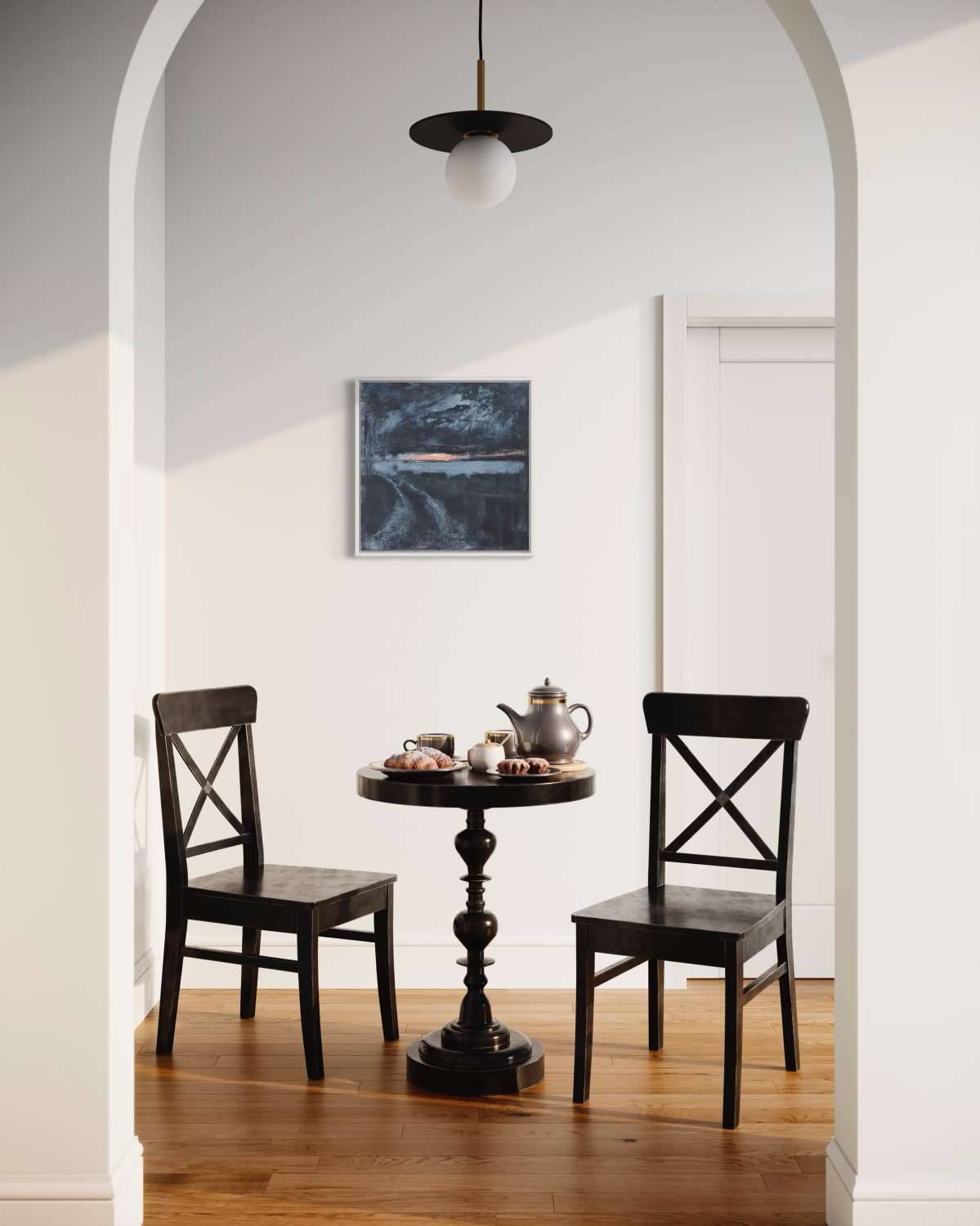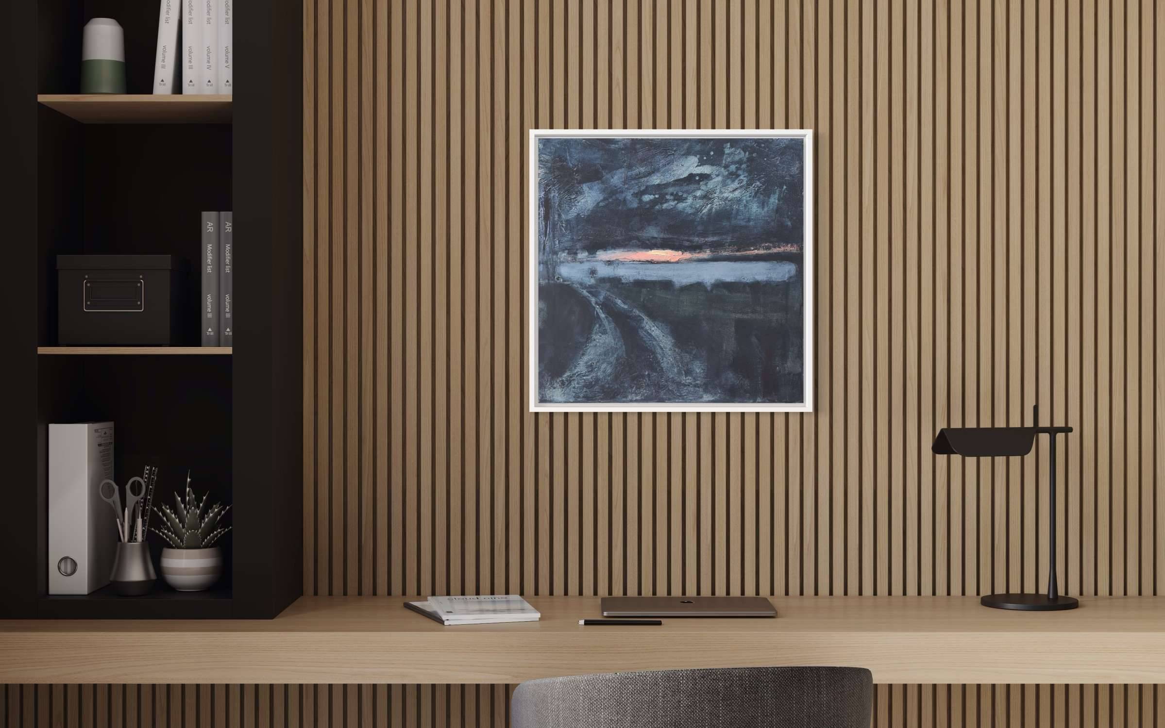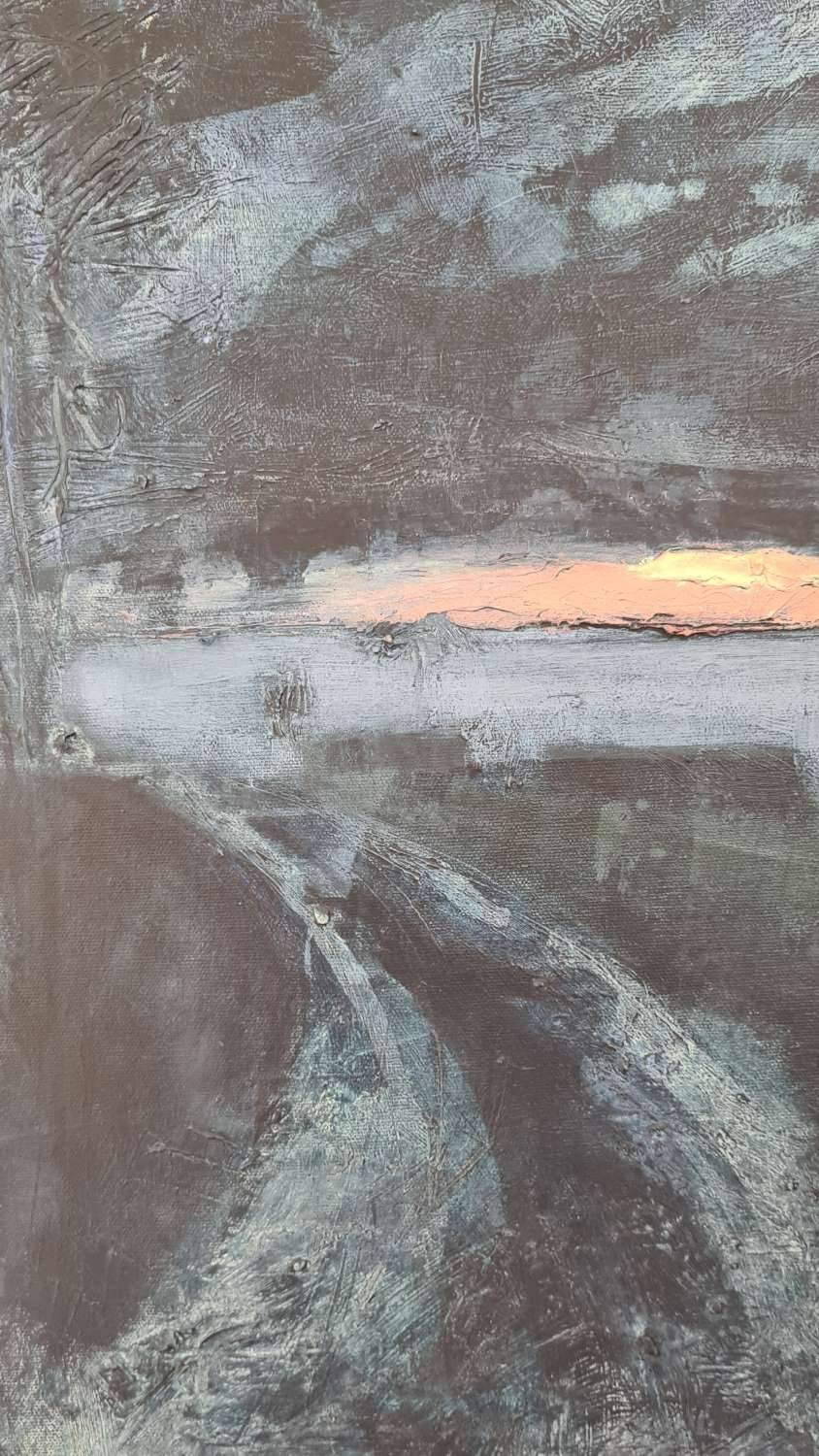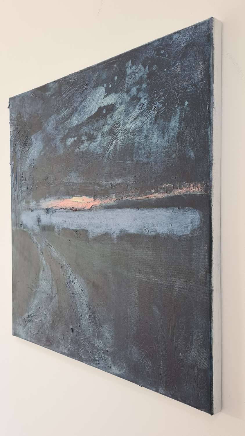 This is a painting inspired by a scene very close to home where you get a glimpse down a farm track of the mouth of the Helford. One winter morning the sunrise was spectacular reds and corals, and the sea below glowed a beautiful lilac. The subtitle to this is “the darkest hour is just before dawn” – that period just before the sun breaks through and it can feel like the dead of night. This painting is almost like travelling in time from the starry night sky to that first burst of sunlight on the horizon.