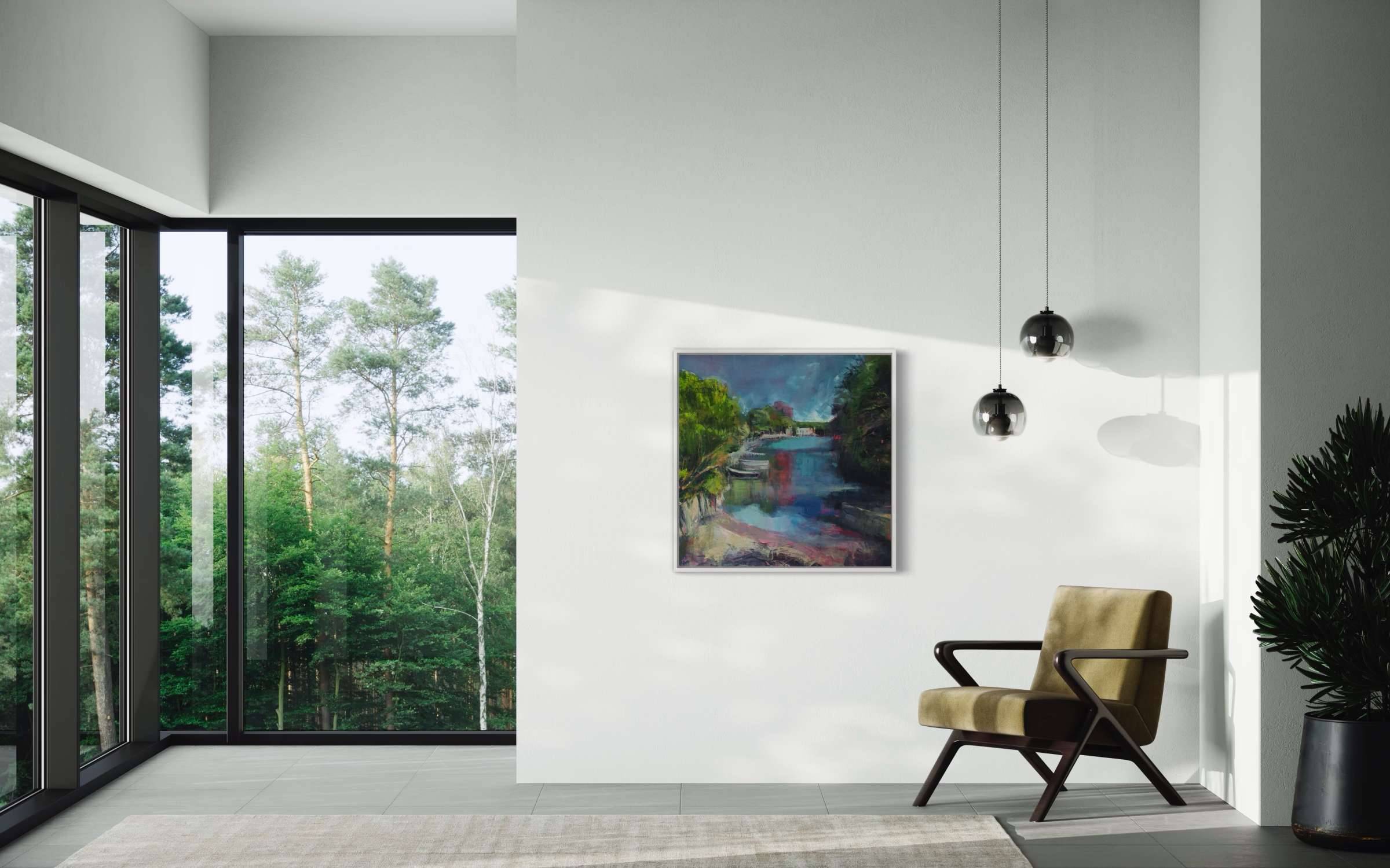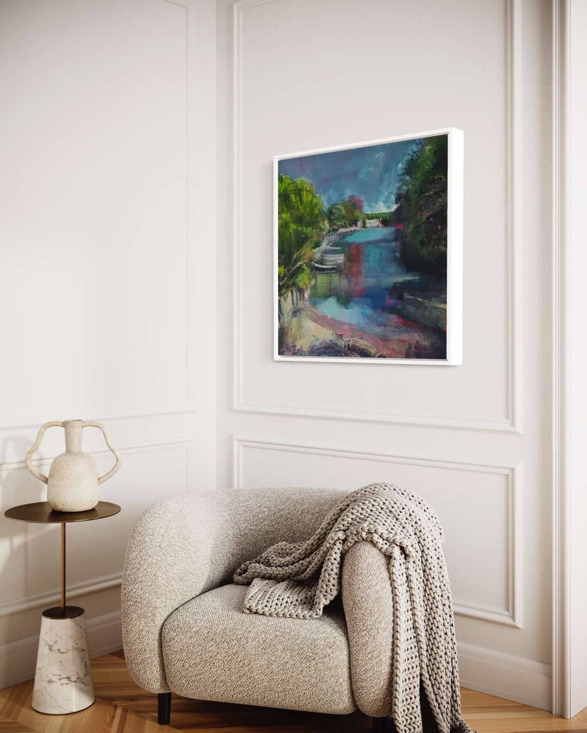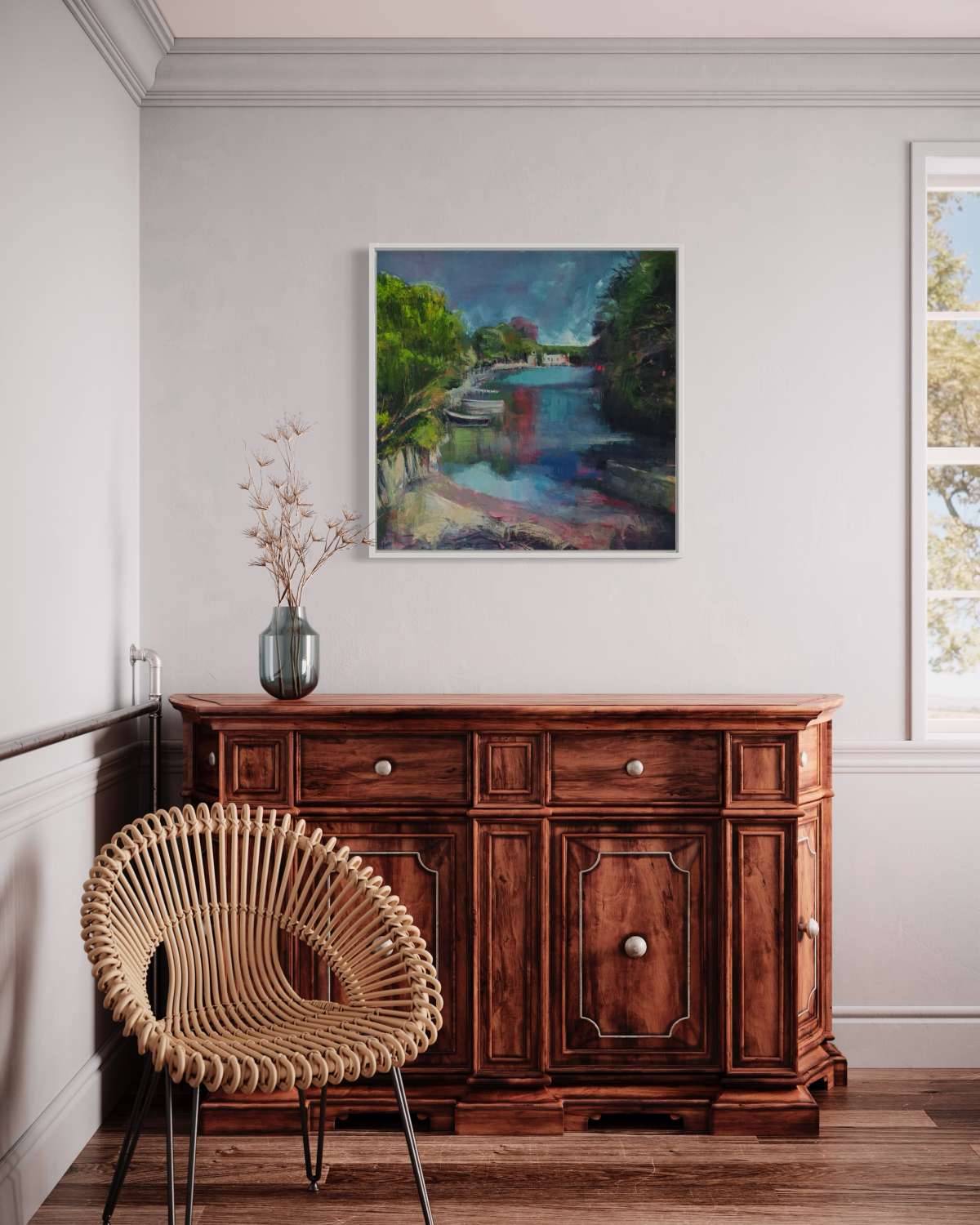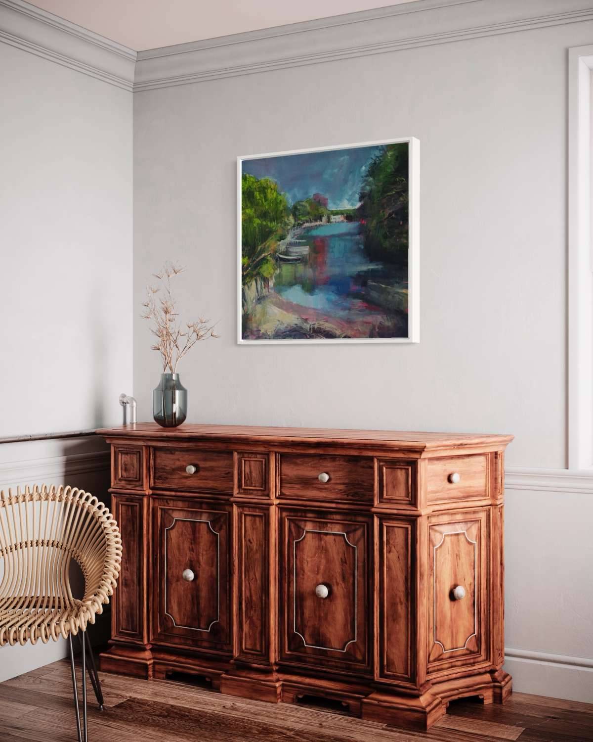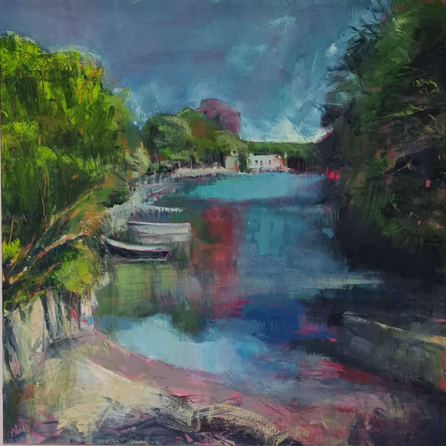 A happy day, the sun shone, the village celebrated. This is the view looking up towards the Port Navas Yacht Club which is a real hub of activity. I wanted to capture the light and joy of the day and accentuate the pinks in the camellias and in the reflected water. This is a brighter palette for me and I think it captures the intensity of light in an English midsummer day