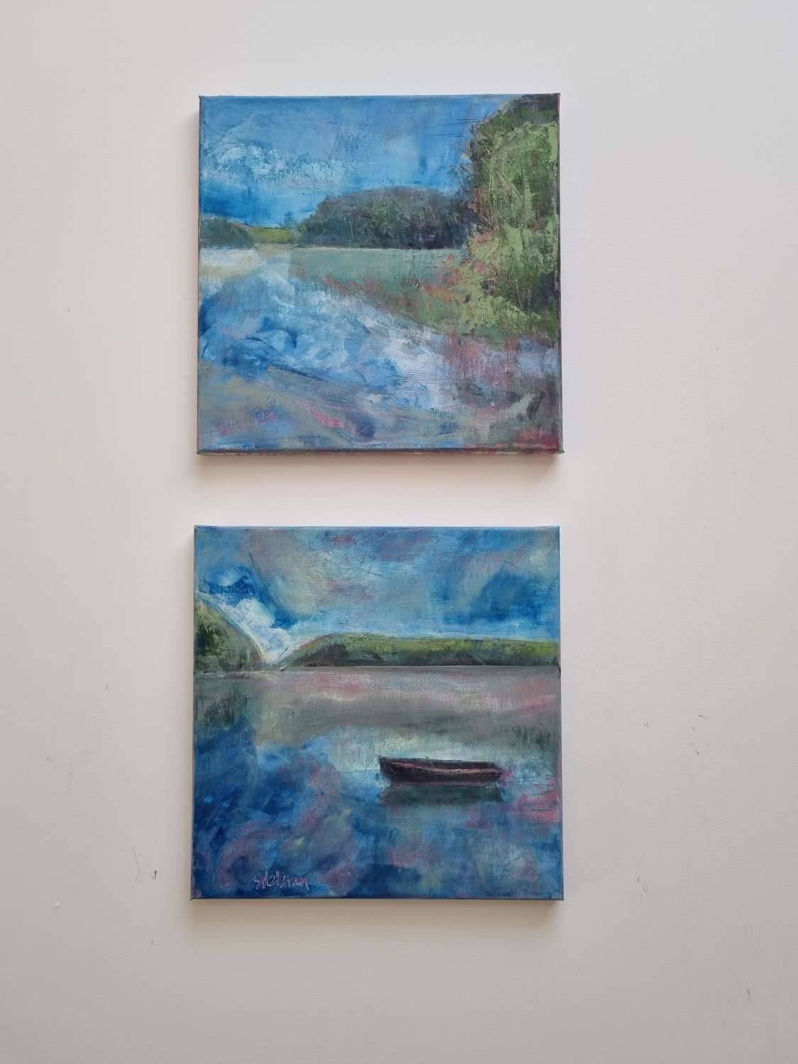 A companion painting to Summer Shade, this shows a tranquil and sunny corner of the Helford River, with luminous tones of blue, pink and green in harmony. A solitary boat drifts on the calm waters, providing a place to focus, to dream, to escape.