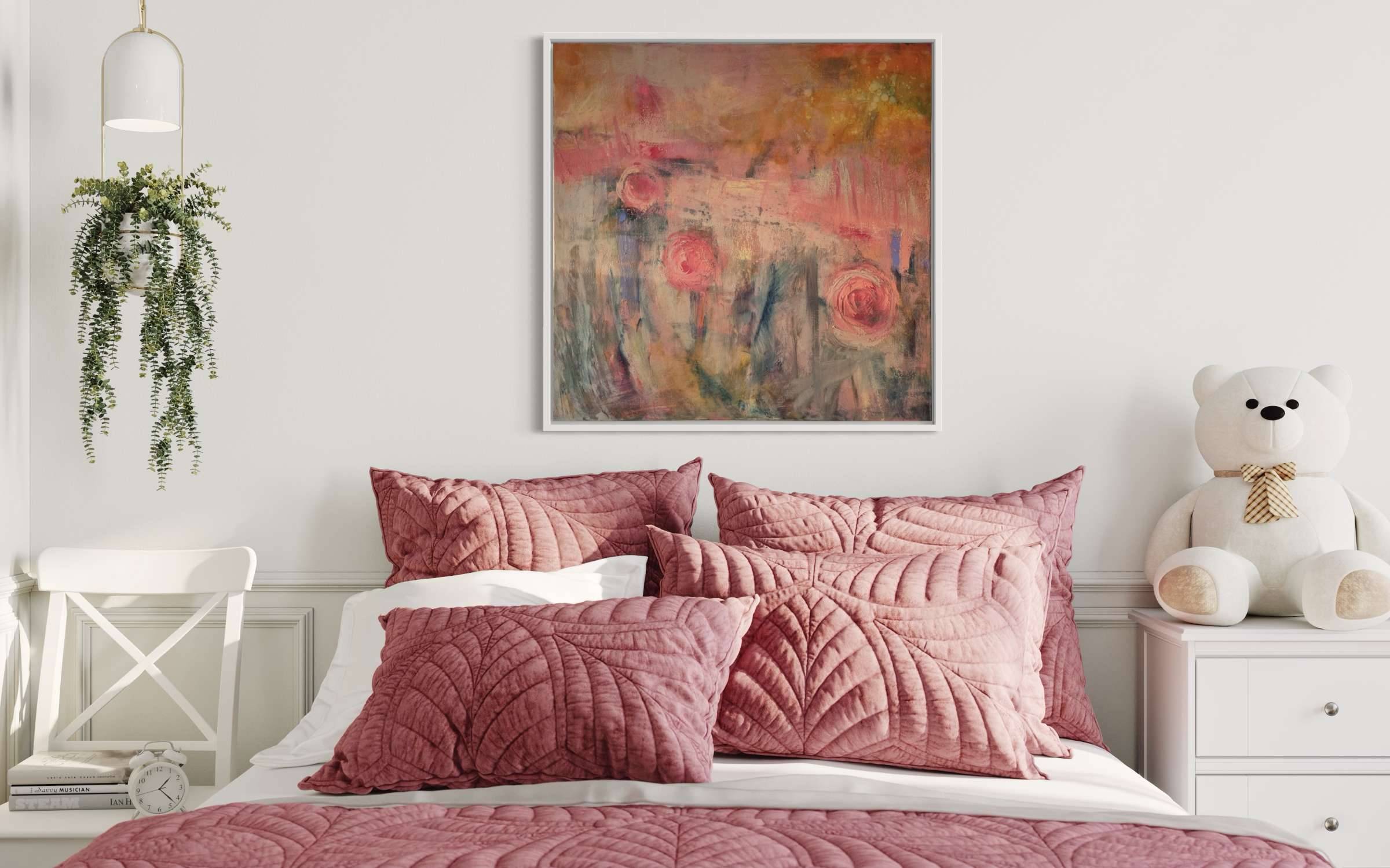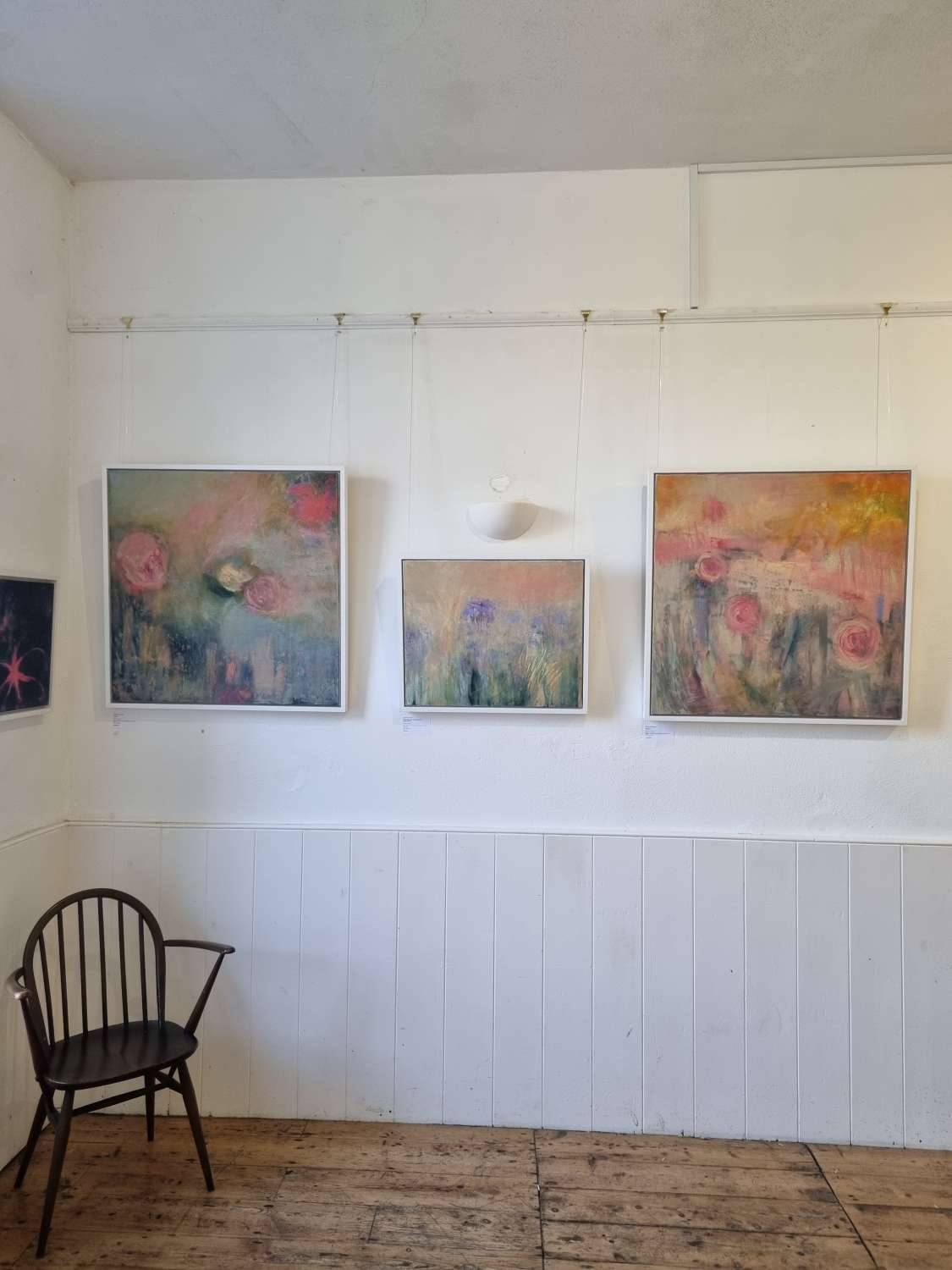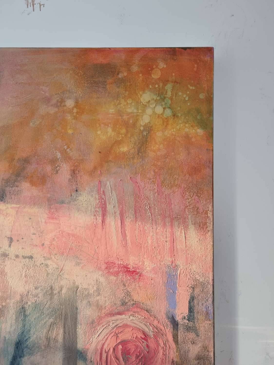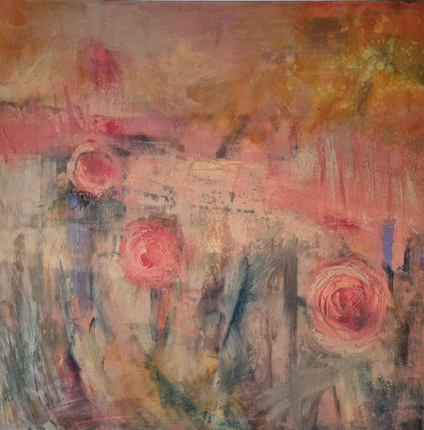The power of pink. This is a garden inspired painting, capturing the low sun on an autumn morning as it sparkles through the glowing embers of blooms, fringed pink in the light. Pink roses, pink peonies, exuberant with life. It is my favourite time of year and my garden is one of my happiest places. The word “bloom” suggests life, potential, emerging shoots. Soft grey green foliage offset the flower heads. I am intrigued by flower paintings, how to bring an abstract sensibility and raw energy to a subject which can easily become stereotypical. A theme I will be exploring much more. The painting is built up of many layers of paint mixed with cold wax, intense hues then knocked back, a tapestry of colour and texture.