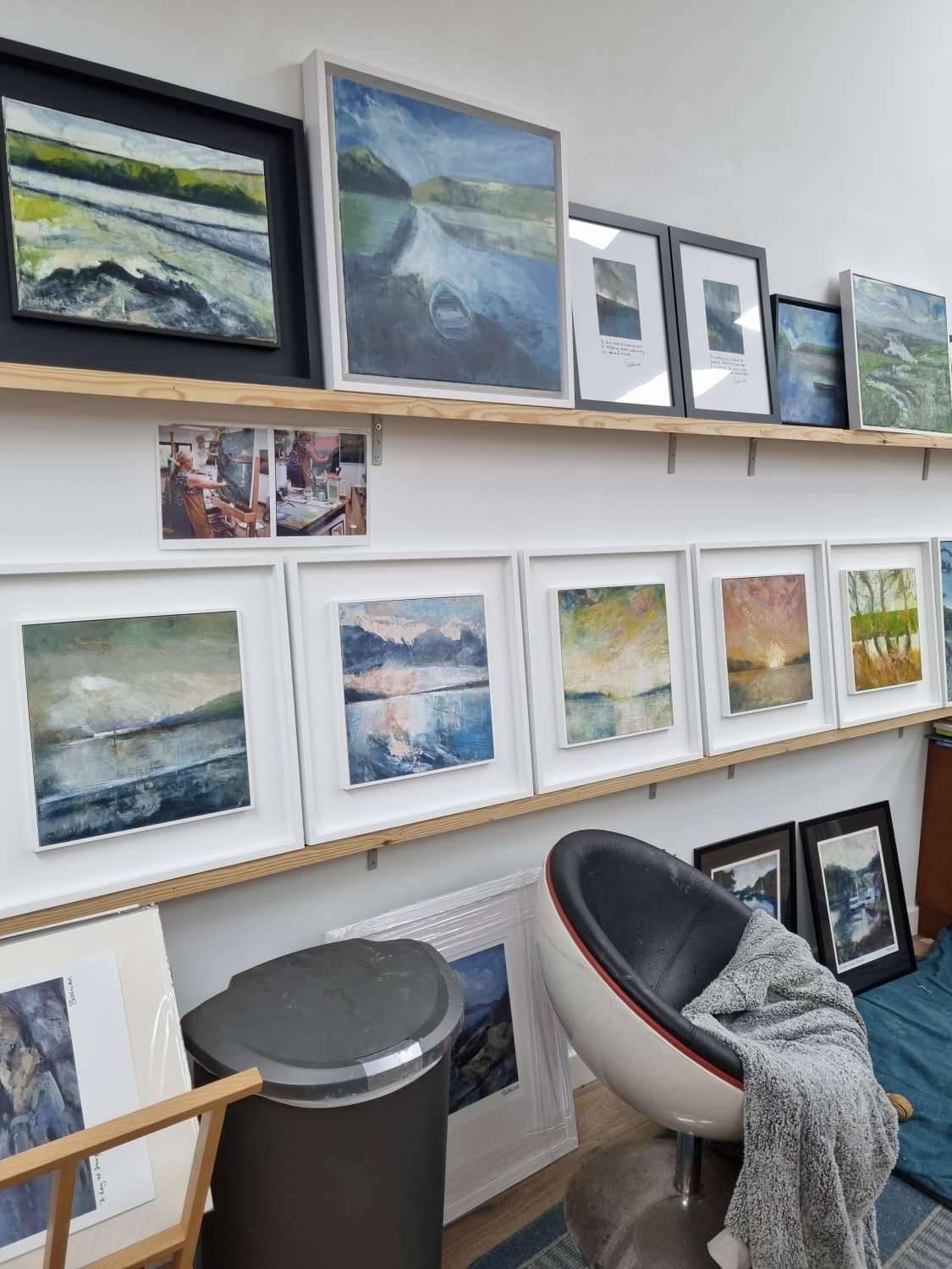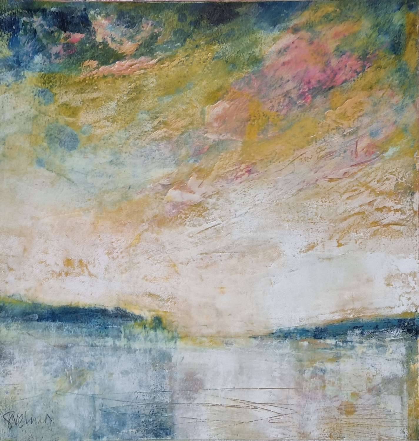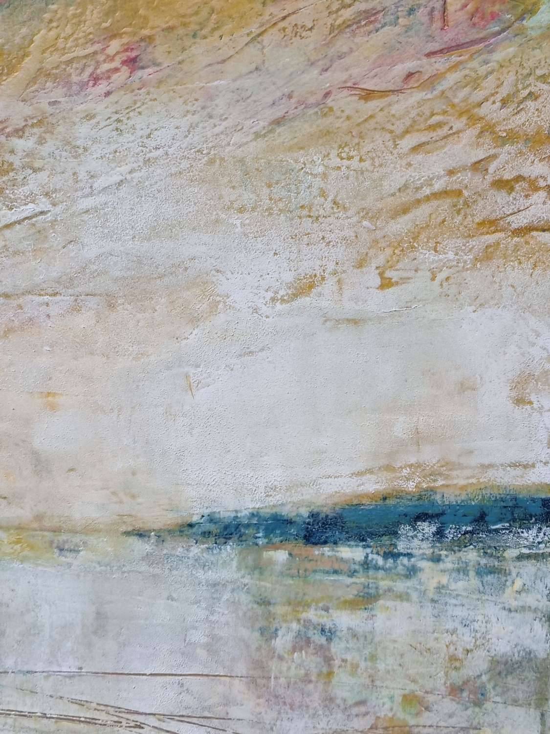 Winter skies are my favourite, every day is a theatre of colour at dawn. This painting was inspired by the pink clouds that appeared overhead on the way down to Grebe one recent morning. With this particular painting I wanted to capture that moment when the night is turning to day, the sun isn’t quite up and the traces of night sky are still lingering. It is a glorious moment of anticipation. The textures of the oil paint mixed with the cold wax medium are ideal for creating that tapestry of colour as the different cloud types float in front of each other, catching the dawn pinks and oranges. By the headlands a faint mist hangs above the water where the water temperature is just slightly warmer than the air.