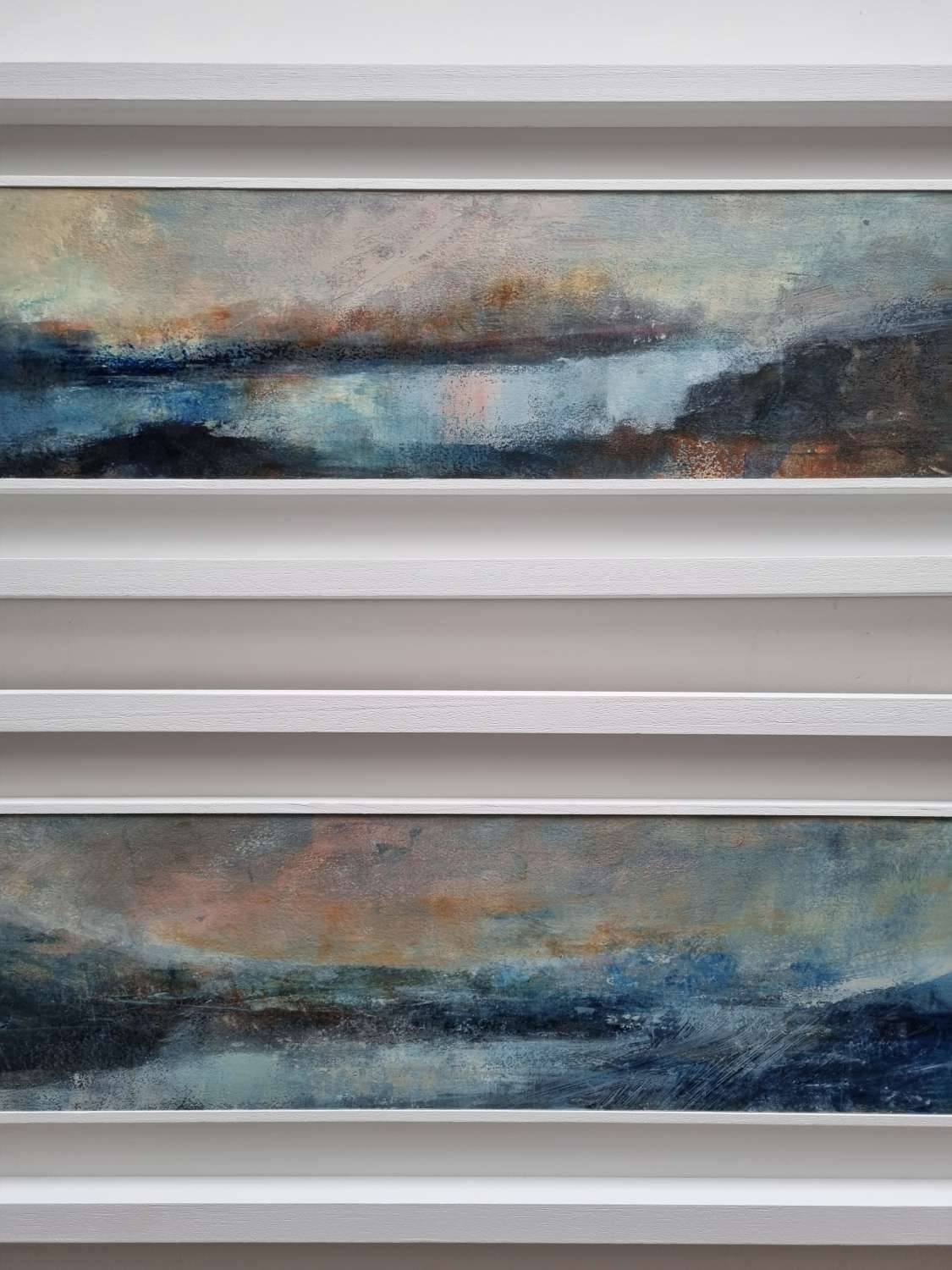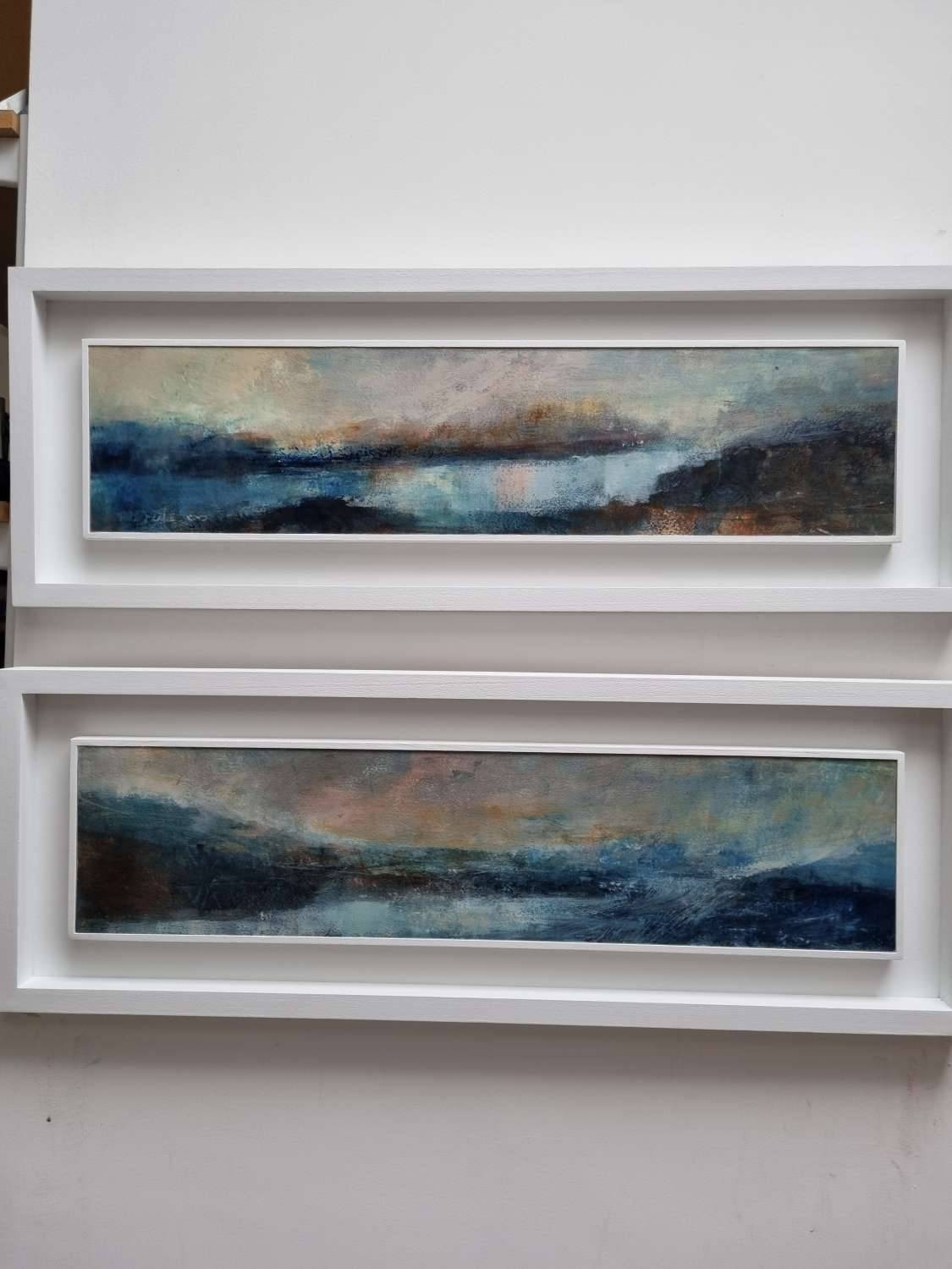 Two abstract Helford landscapes that have been inspired by the moody winter dawns and dusks. “Call of the creek” is definitely rooted in dog walks by Scott’s Quay, listening to the curlews singing their distinctive song as they flit overhead. The further up the Helford you go, the more you feel you are travelling back in time, as the river narrows and the river bank closes in with its ancient woodland that meets the water’s edge. There are so many creeks that come off the main river, their watery paths disappear around headlands to join the main river, the light catching them as they bend their way out of sight.