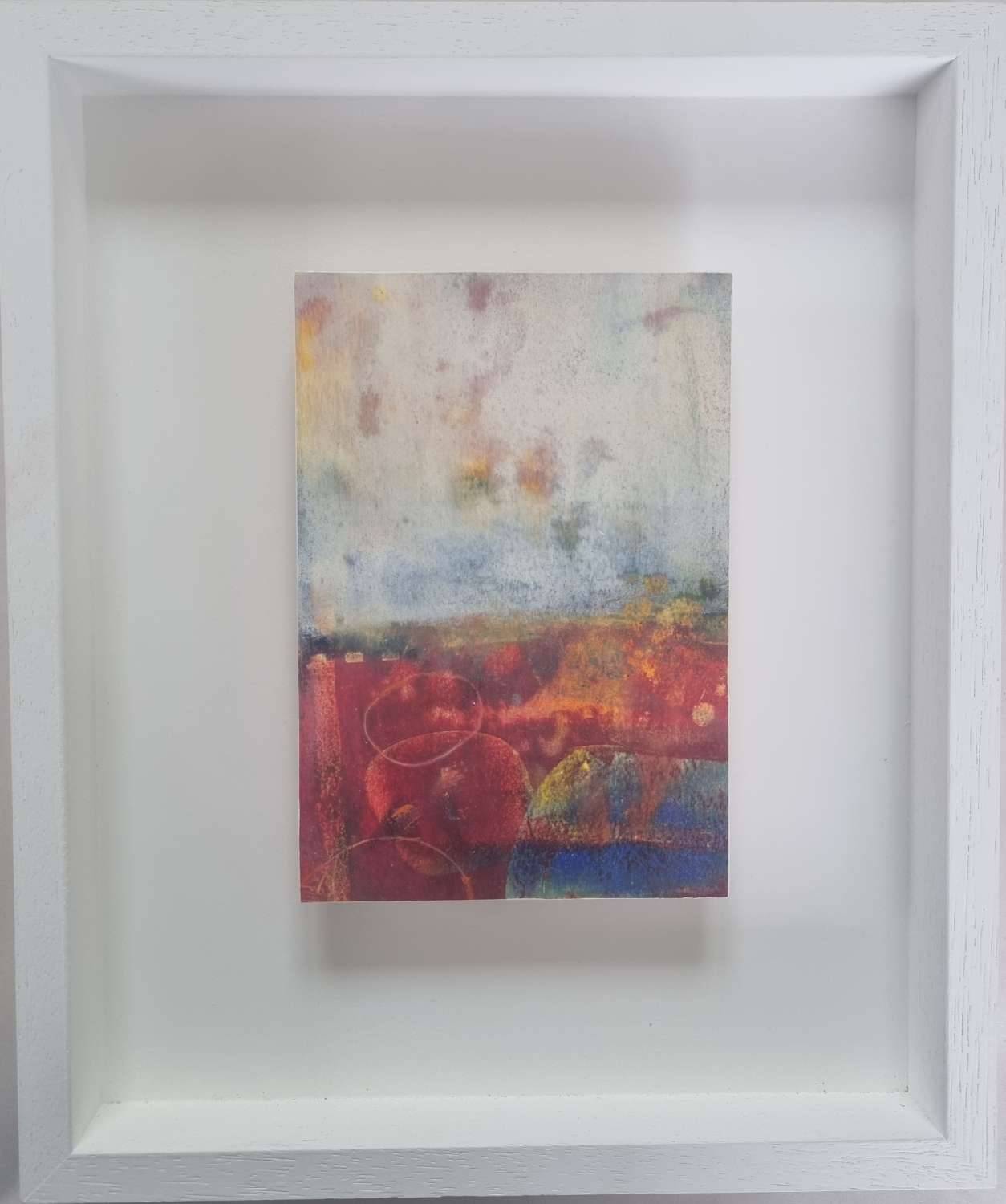 The painting is bonded to board is framed in a wood tray frame painted white. The framed size is 32.5cm x 27cm