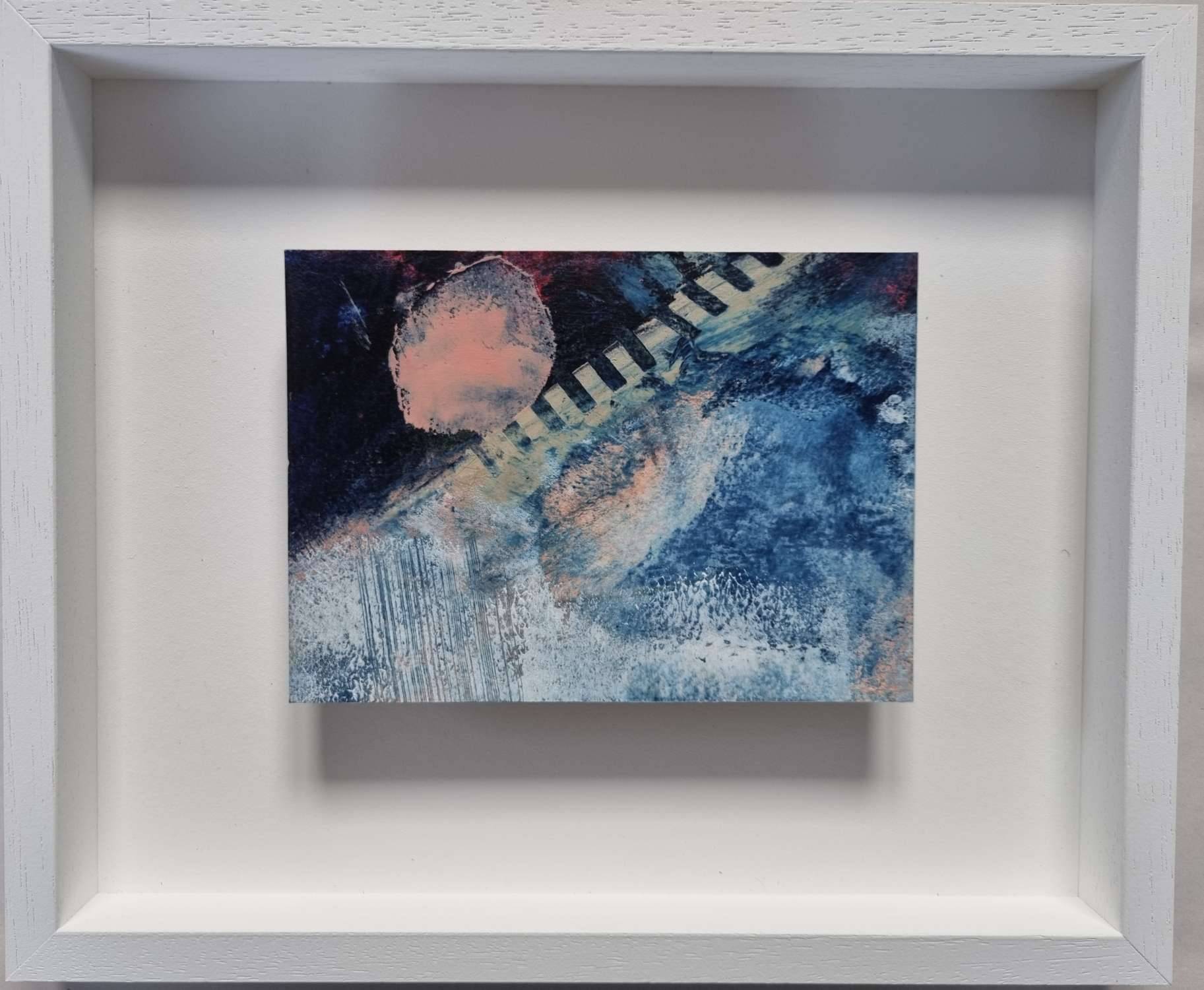 This small painting is painted using oil and cold wax on Arches Huile paper which is bonded to board and comes in a white tray frame.