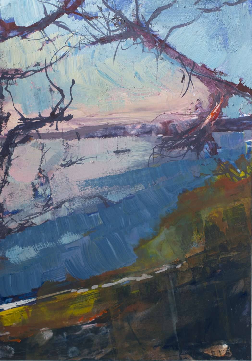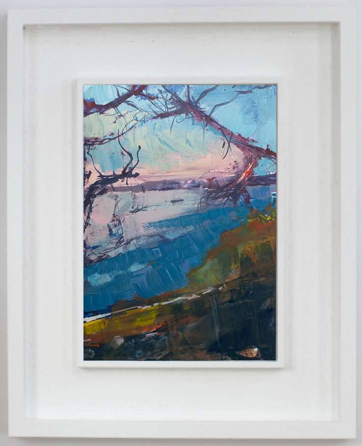 From My Helford Sketchbook collection. Painted in gouache, with an accompanying photo of handwritten text and location photo. Framed in a white wood St Ives frame measuring 32 x 25.5cm.
