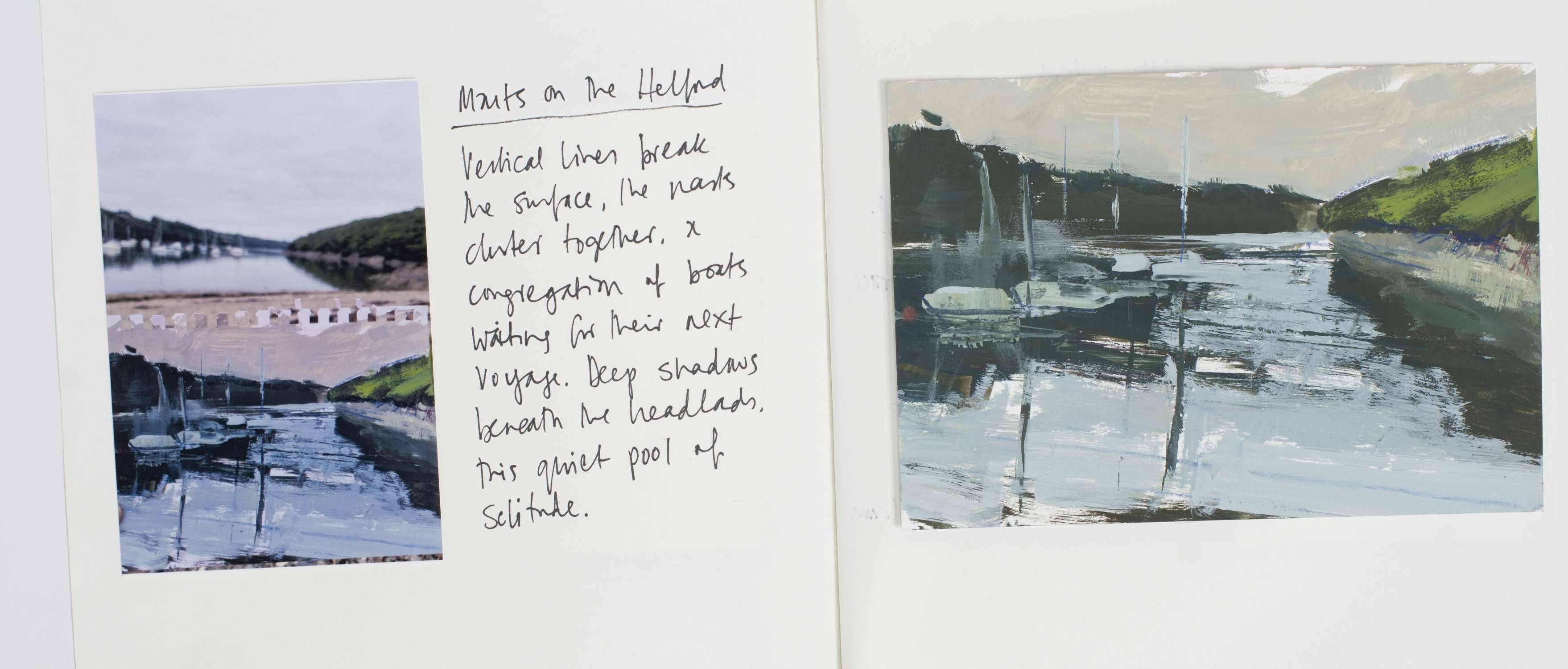 From My Helford Sketchbook collection. Painted in gouache, with an accompanying photo of handwritten text and location photo. Framed in a white wood St Ives frame measuring 32 x 25.5cm. Price includes postage and packing for UK addresses.