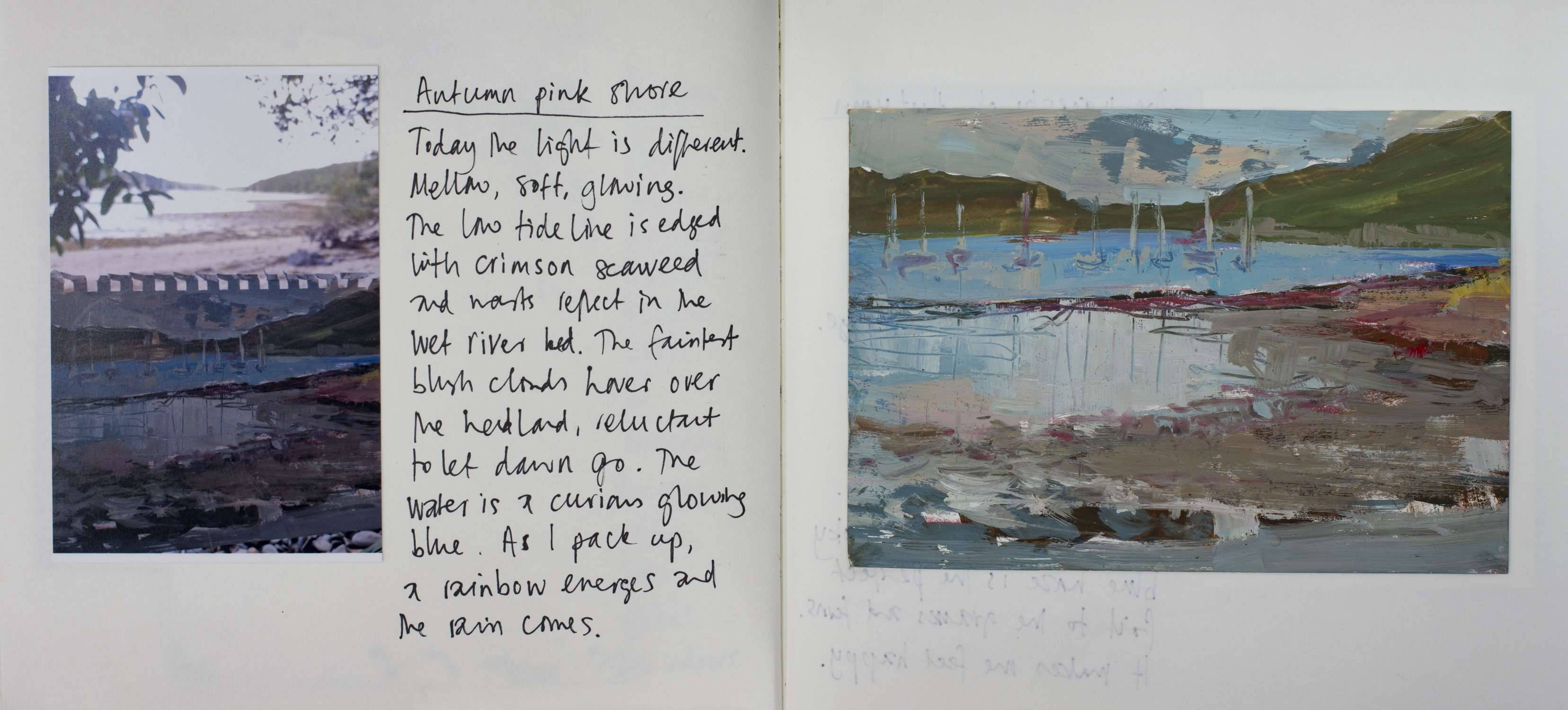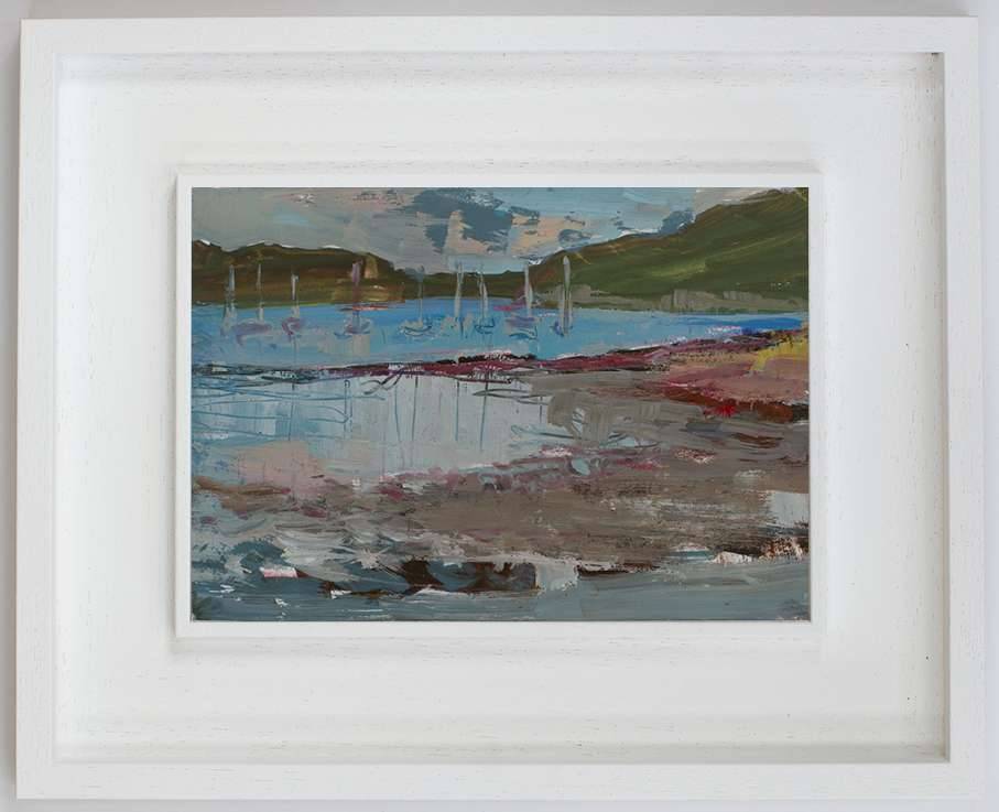 From My Helford Sketchbook collection. Painted in gouache, with an accompanying photo of handwritten text and location photo. Framed in a white wood St Ives frame measuring 32 x 25.5cm. Price includes postage and packing for UK addresses.
