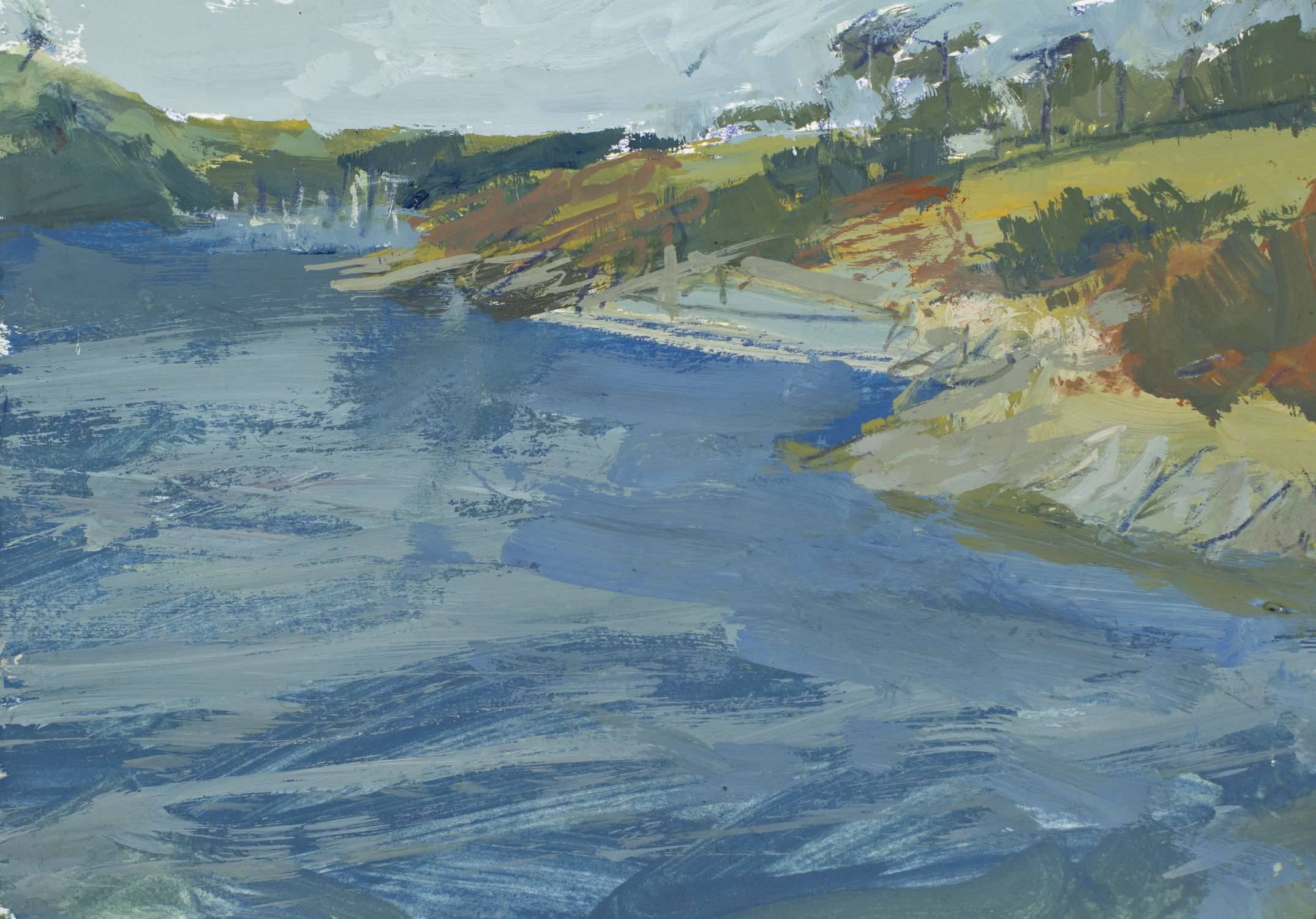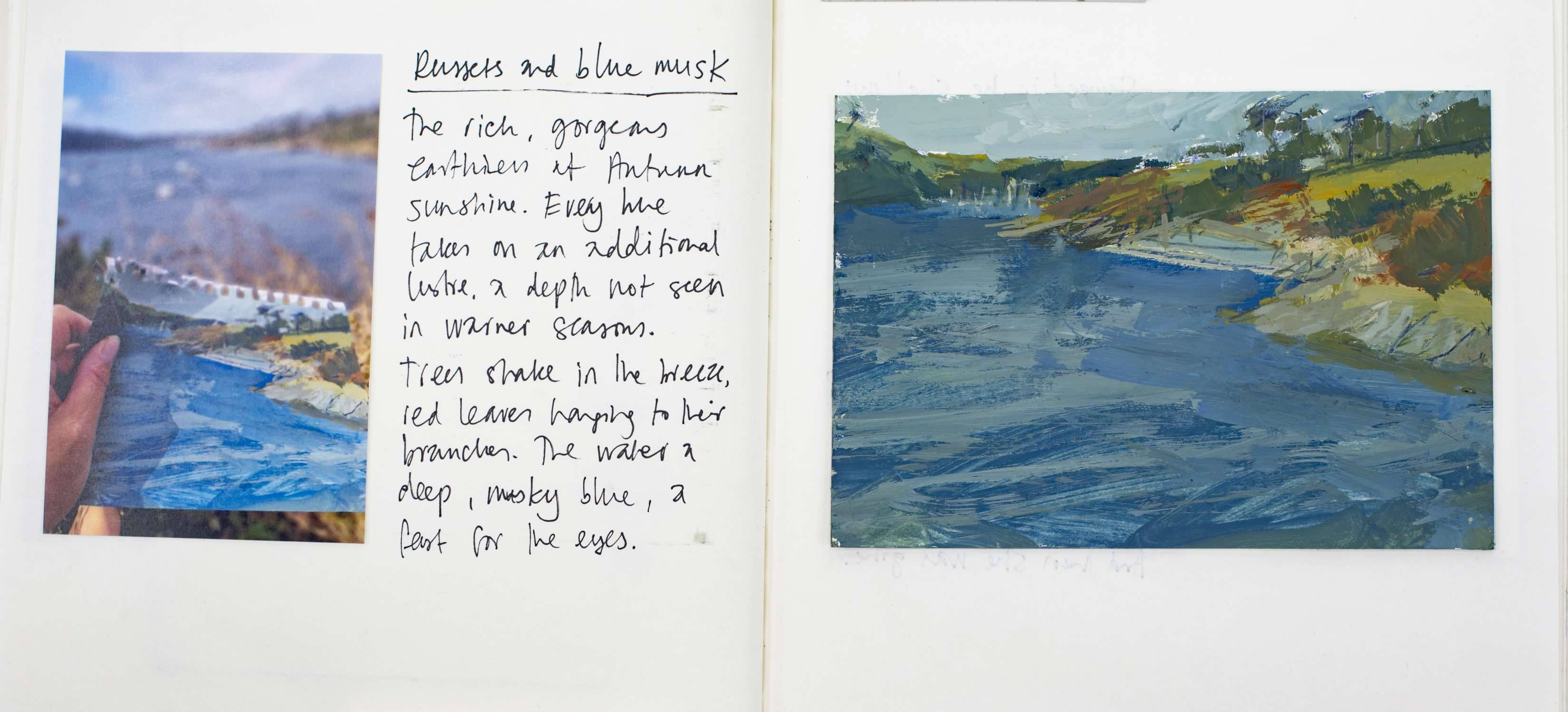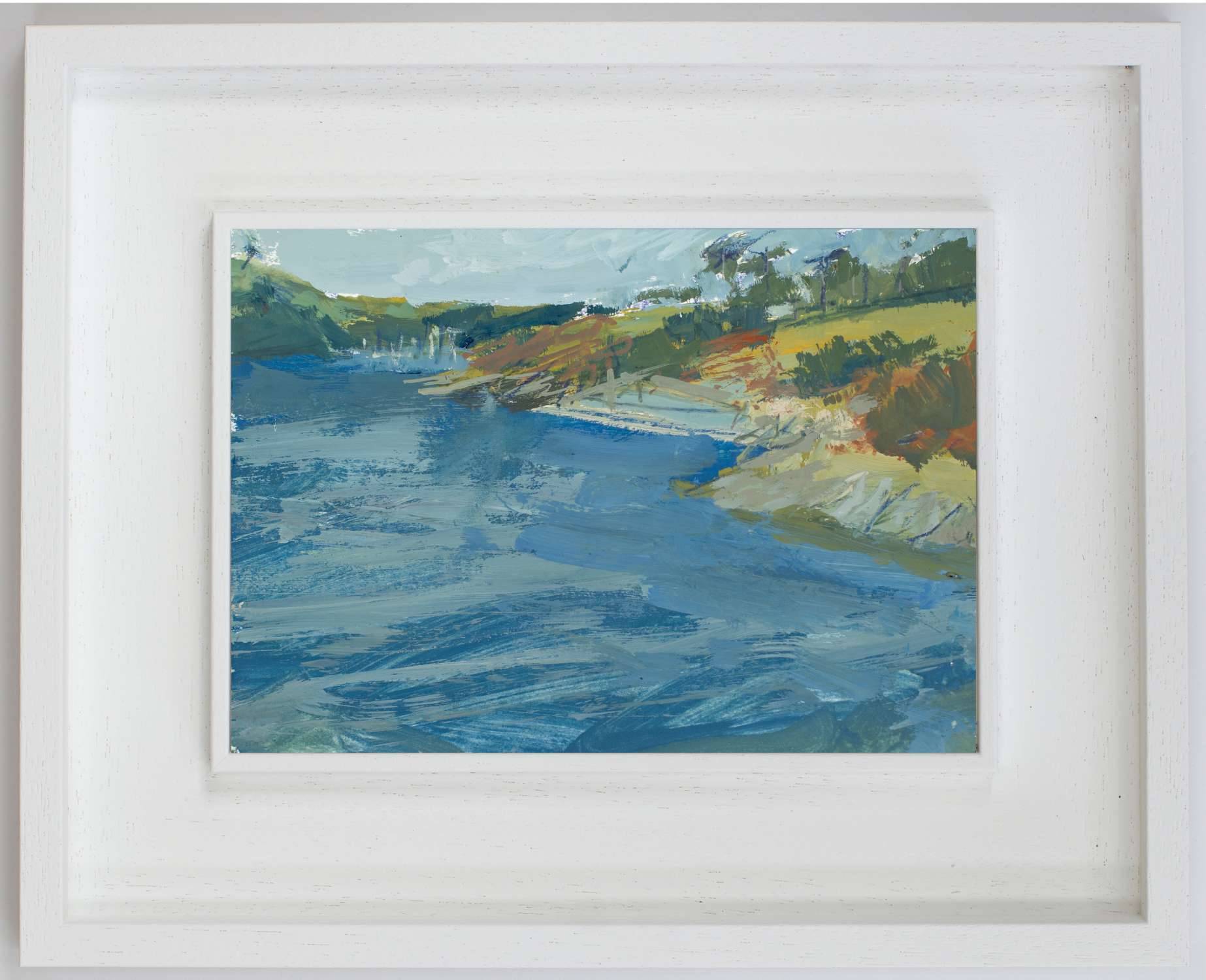 From My Helford Sketchbook collection. Painted in gouache, with an accompanying photo of handwritten text and location photo. Framed in a white wood St Ives frame measuring 32 x 25.5cm. Price includes postage and packing for UK addresses.