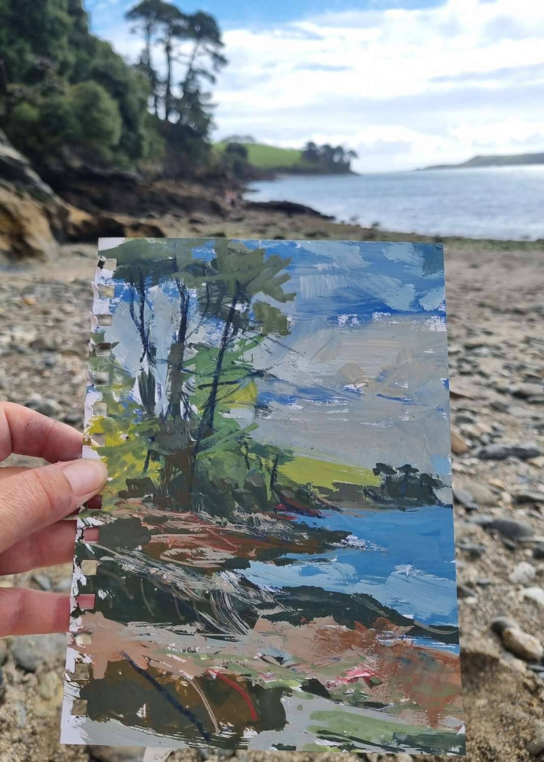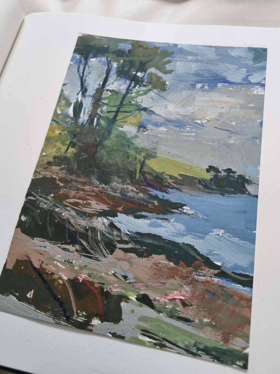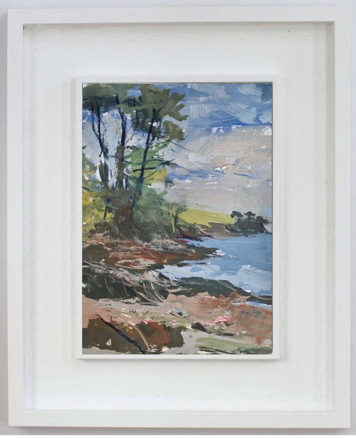 From My Helford Sketchbook collection. Painted in gouache, with an accompanying photo of handwritten text and location photo. Framed in a white wood St Ives frame measuring 32 x 25.5cm. Price includes postage and packing for UK addresses.