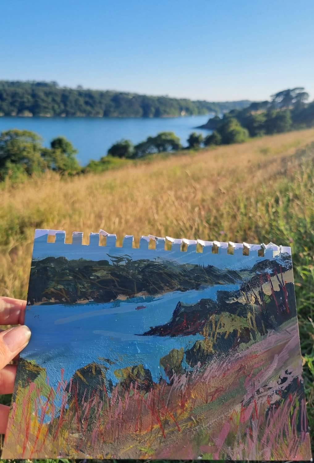 From My Helford Sketchbook collection. Painted in gouache, with an accompanying photo of handwritten text and location photo. Framed in a white wood St Ives frame measuring 32 x 25.5cm. Price includes postage and packing for UK addresses.