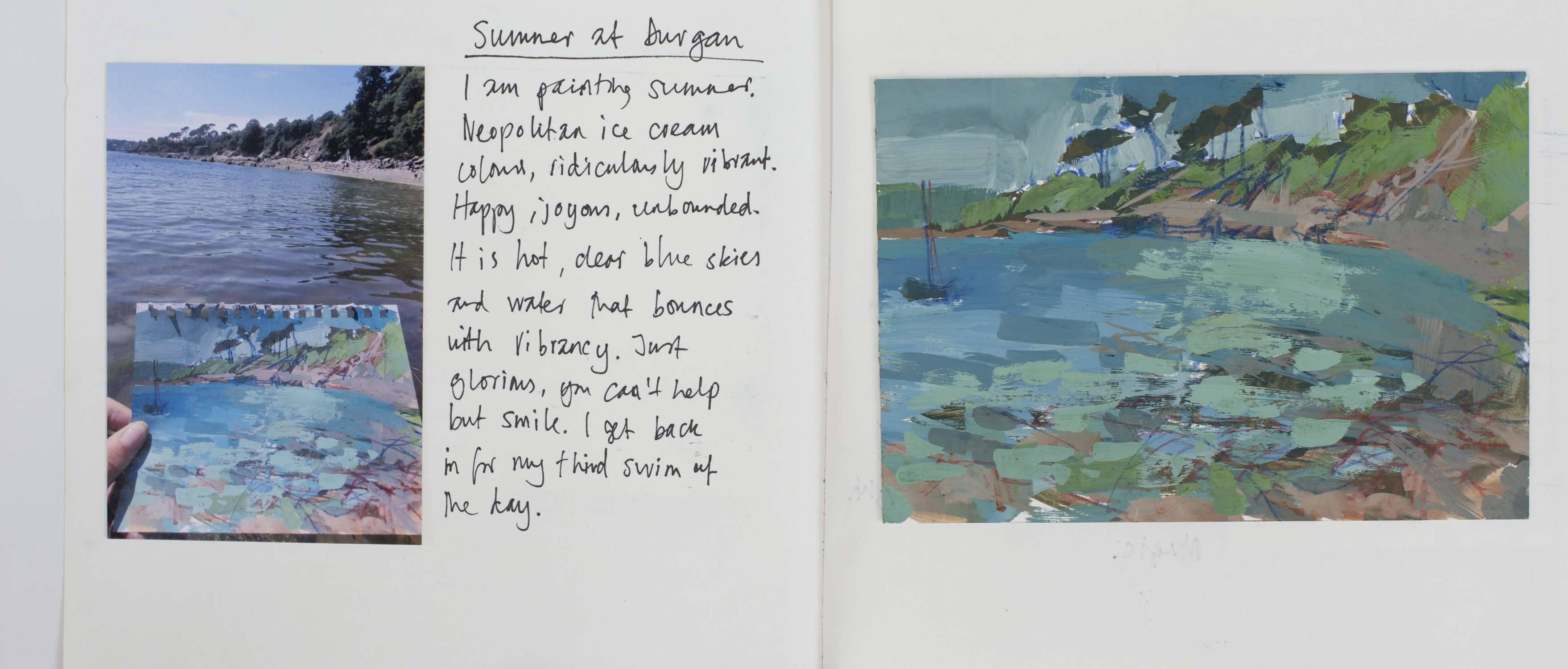 I am painting summer. Neapolitan ice cream colours, ridiculously vibrant. Happy, joyous, unbounded. It is hot, clear blue skies and water that bounces with vibrancy. Just glorious, you can’t help but smile. I get back in for my third swim of the day.