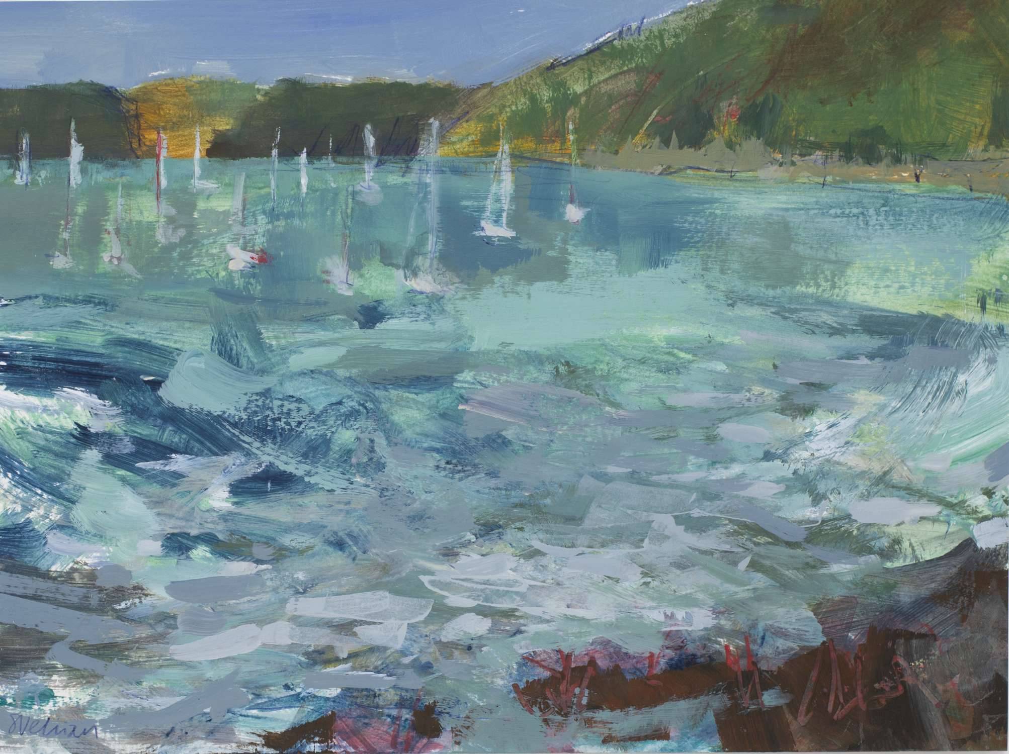 The last week of summer. Autumn can already be seen and felt in the orange tints and cool breeze. Another month in the water for these boats, they lap up the tropical colours today, the stiffening breeze flecking the turquoise as the tide rushes in.