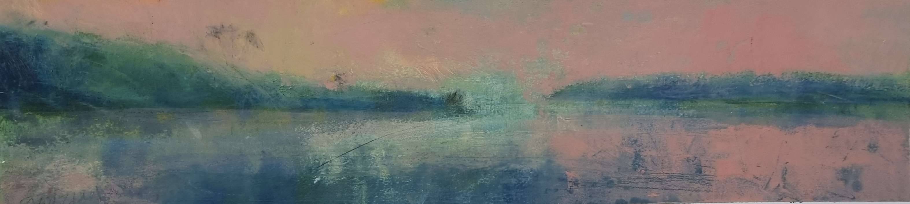 I have been working on these panoramic sunrise paintings for a couple of weeks, building up layers of oil and cold wax. I wanted to capture the amazing feeling of immersion in colour and light of a sunrise swim. This painting captures the moments before sunrise, where the sky is glowing pink and the water too. This painting is mounted on board so I can frame them without glass, sealed with wax. Price includes a white painted wood St Ives moat frame.
