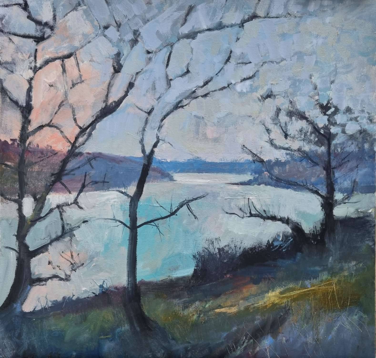 The branches stirred against the sky. The familiar glow of the opal through the trees, luminous and calming. Ancient twisted limbs embrace, their outlines refract the sky and water. The distant headland shimmers in a blue haze.